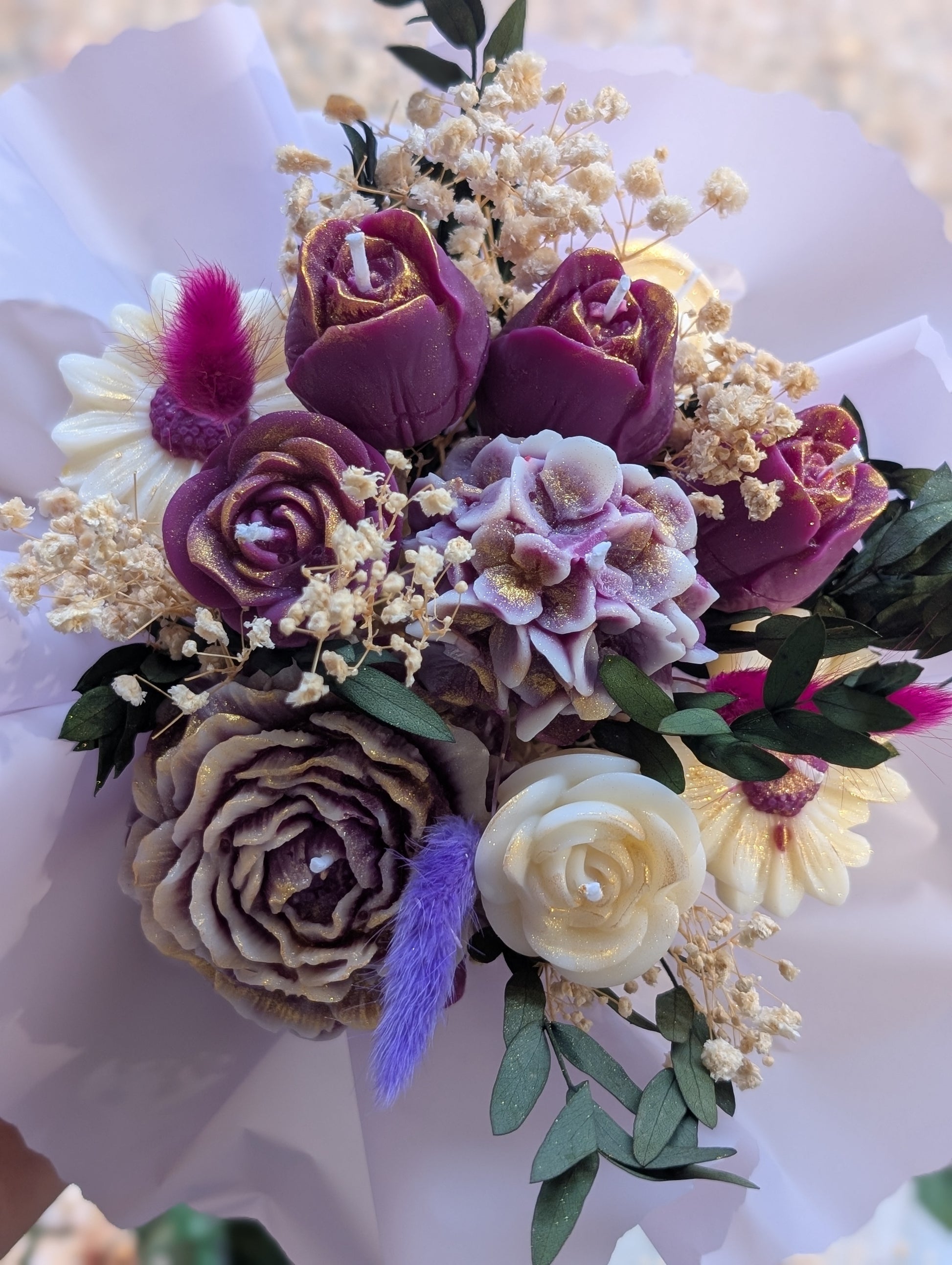 Un bouquet unique qui marie la délicatesse des fleurs à l’élégance des bougies. Réalisé à la main, il se compose de bougies sculptées en forme de roses et de fleurs aux teintes douces (rose poudré, violet et touches dorées) accompagnées de feuillages et fleurs séchées pour une finition raffinée.