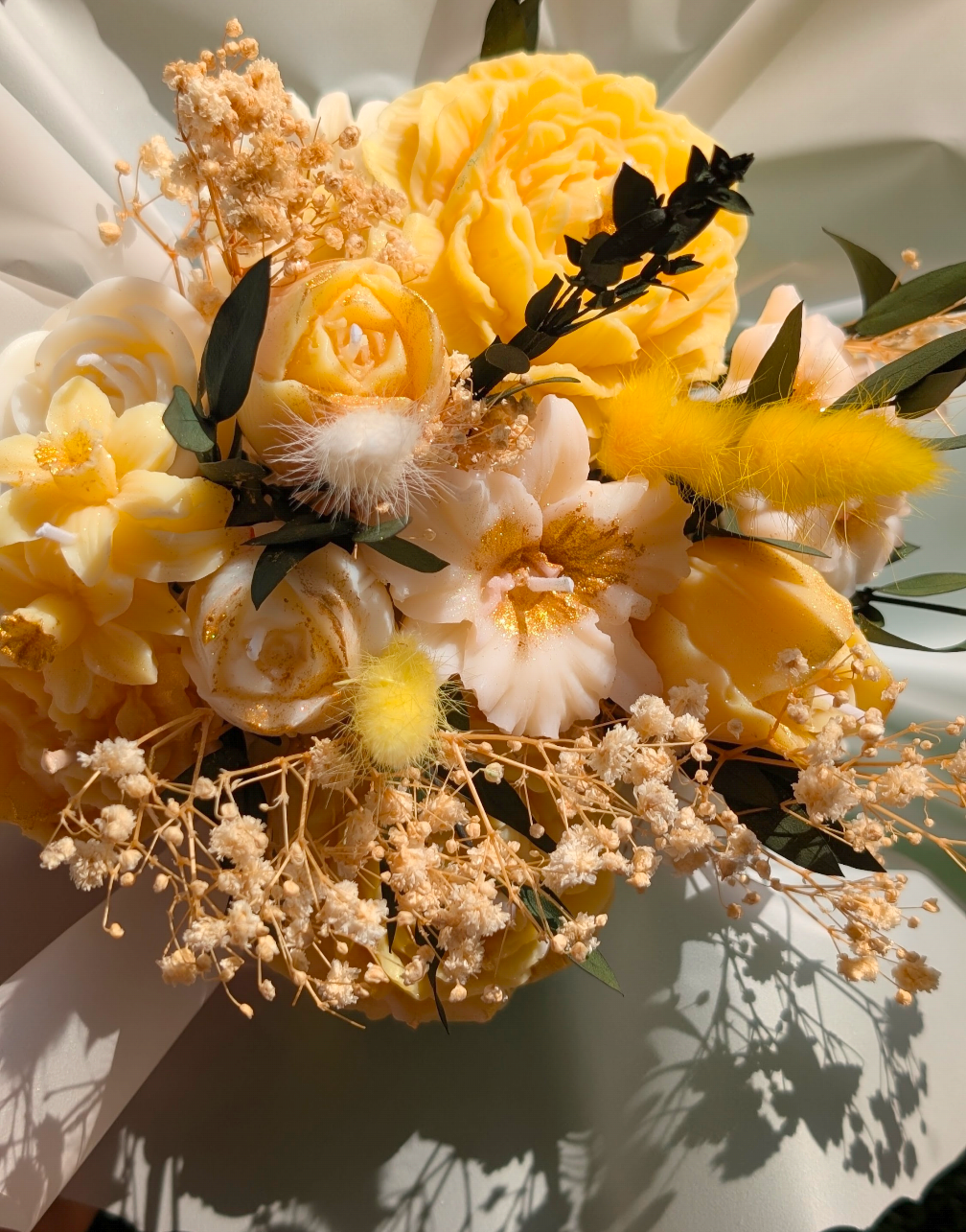 Un bouquet unique qui marie la délicatesse des fleurs à l’élégance des bougies. Réalisé à la main, il se compose de bougies sculptées en forme de roses et de fleurs aux teintes douces accompagnées de feuillages et fleurs séchées pour une finition raffinée.