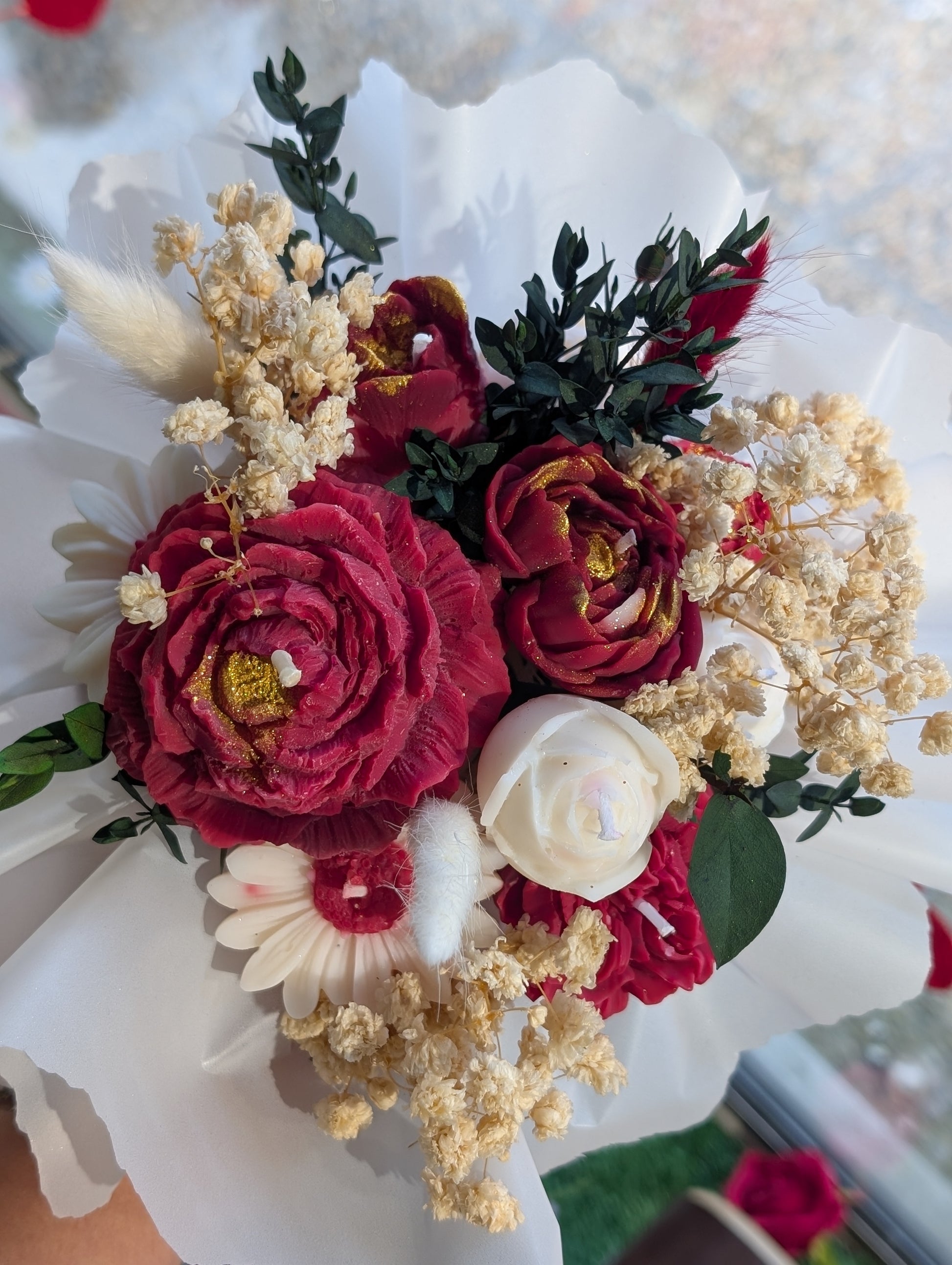 Mélange intense de bordeaux profond, blanc ivoire et feuillage vert foncé, rehaussé de fleurs séchées dorées.
