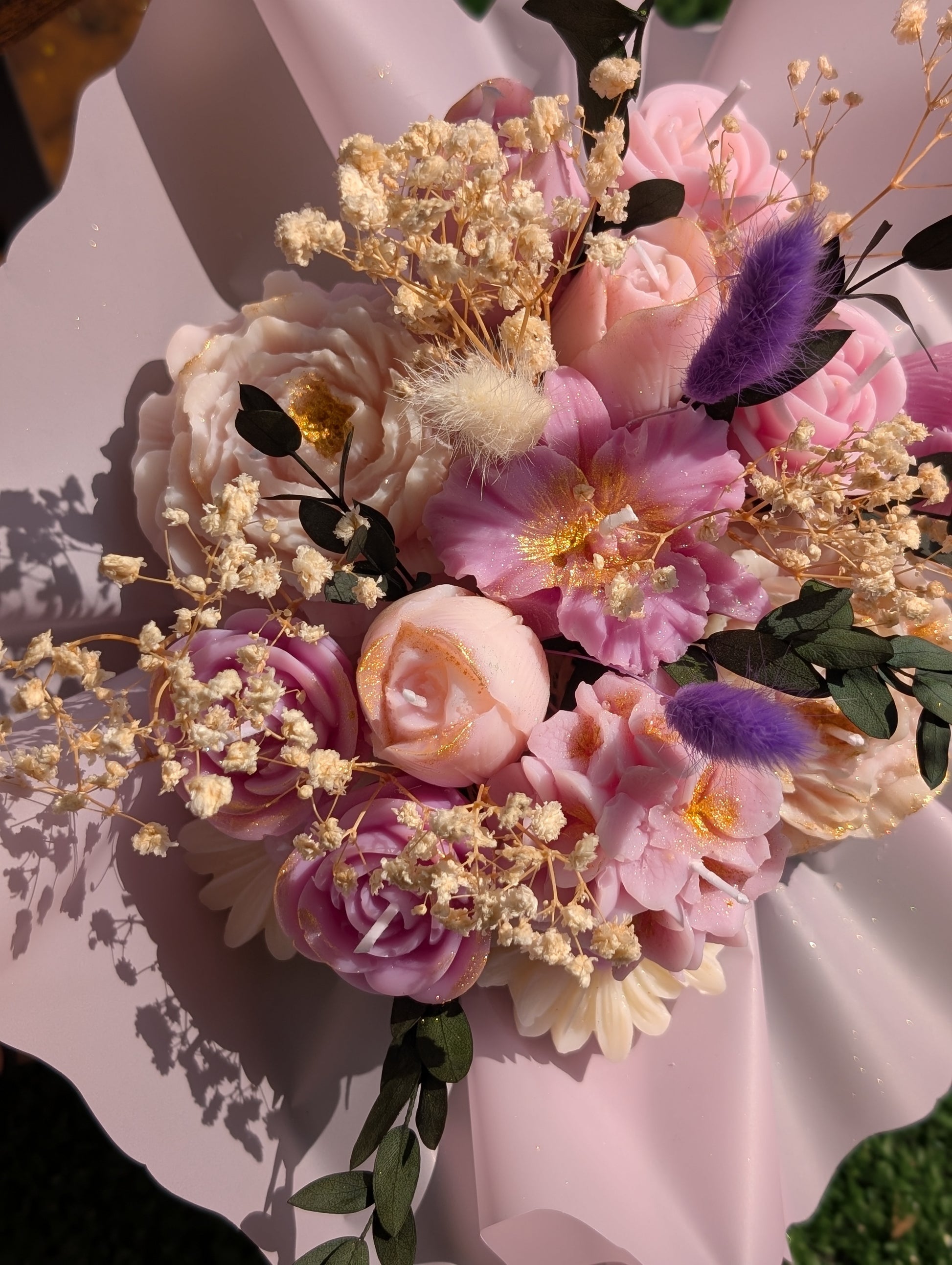 Un bouquet unique qui marie la délicatesse des fleurs à l’élégance des bougies. Réalisé à la main, il se compose de bougies sculptées en forme de roses et de fleurs aux teintes douces (rose poudré, violet et touches dorées) accompagnées de feuillages et fleurs séchées pour une finition raffinée.